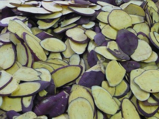 いもせんべいはサツマイモの形を生かすため、両端にたくさんの廃棄する部分がでます。 東洋堂では、これを豚のエサに活用しています。豚さんもイモブタになって、肉があまくて おいしくなるそうです。